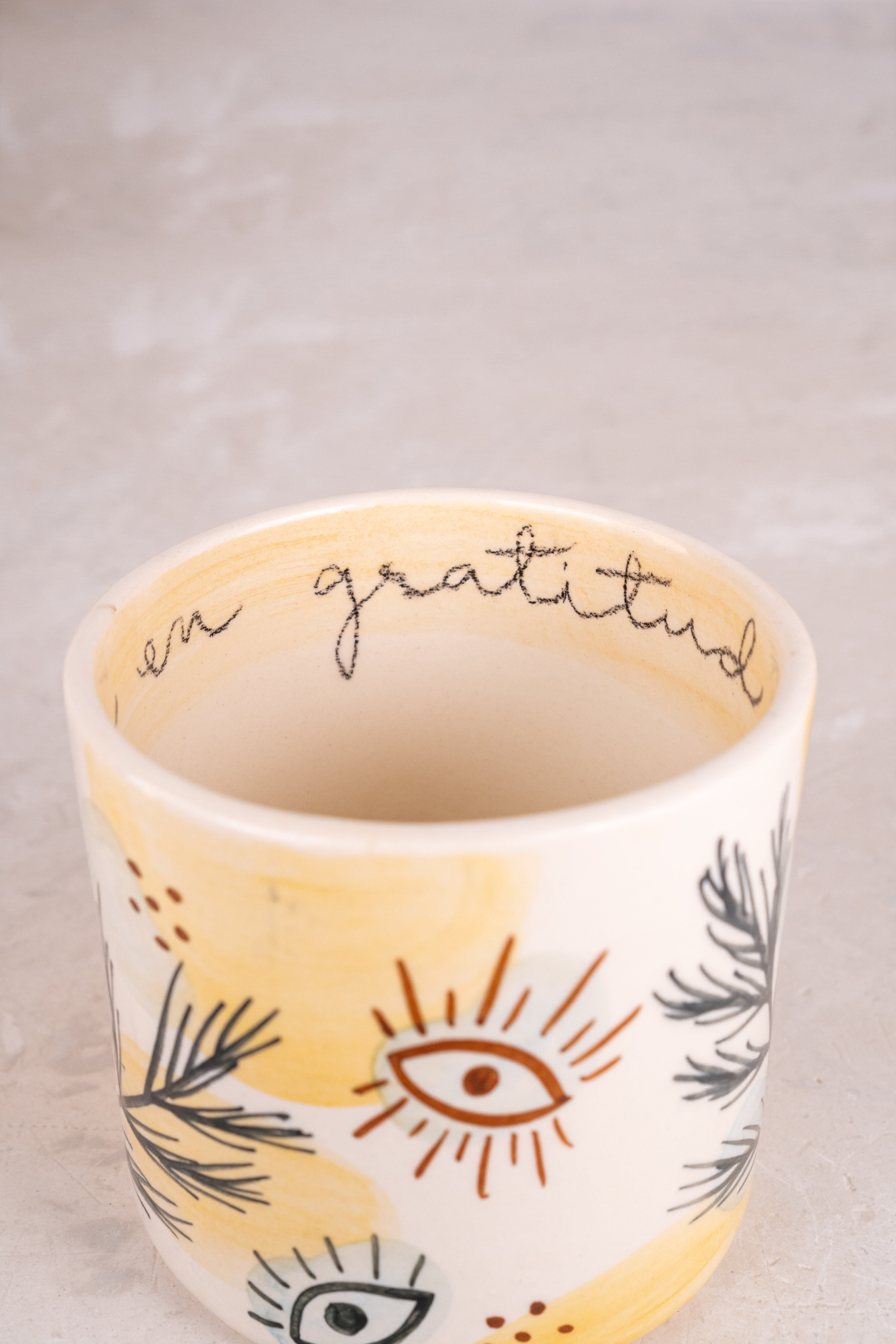 Este pocillo está inspirado en las acciones diarias que nos genera abundancia, que nos hace recordar la sensación de apreciación y goce por los eventos cotidianos, como sentarse en la mañana a tomar un té, un café, el calor del sol de la mañana o las palaras cálidas de tus seres amados.