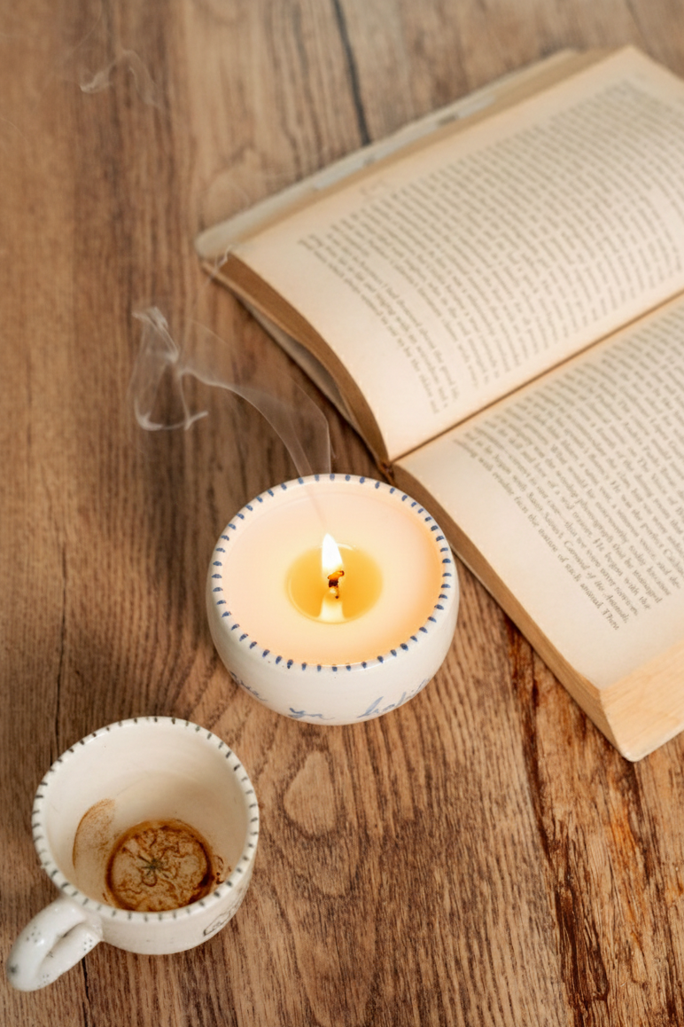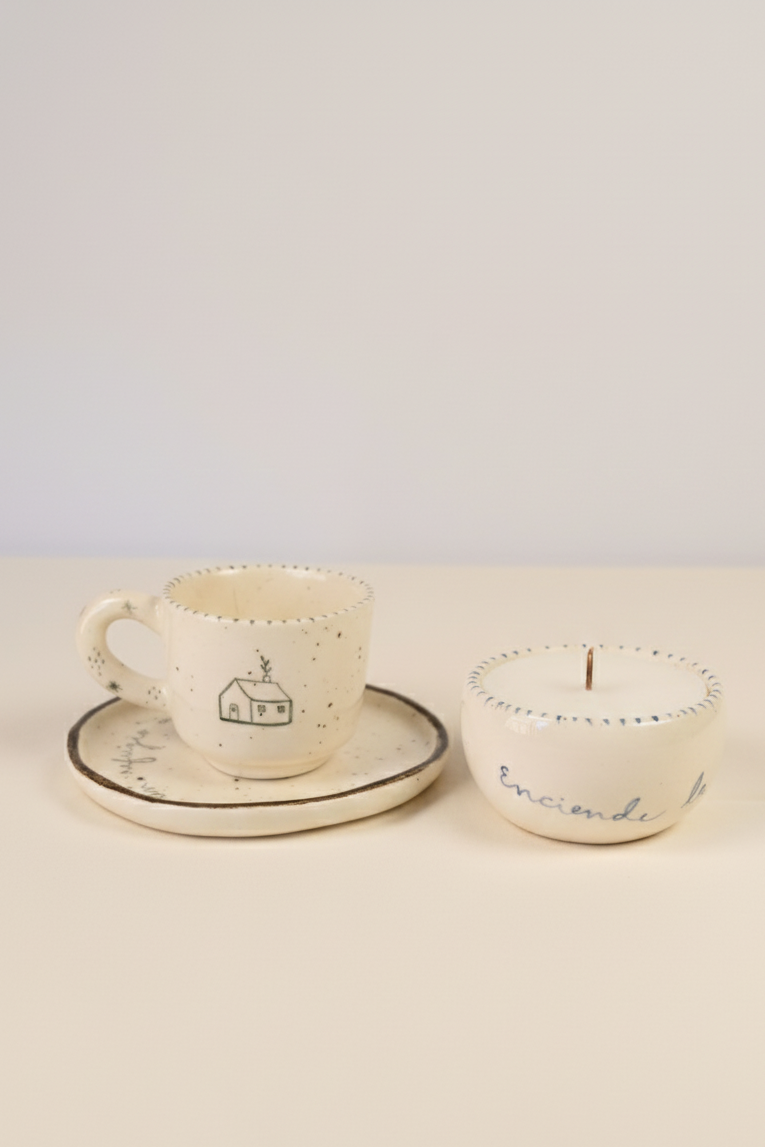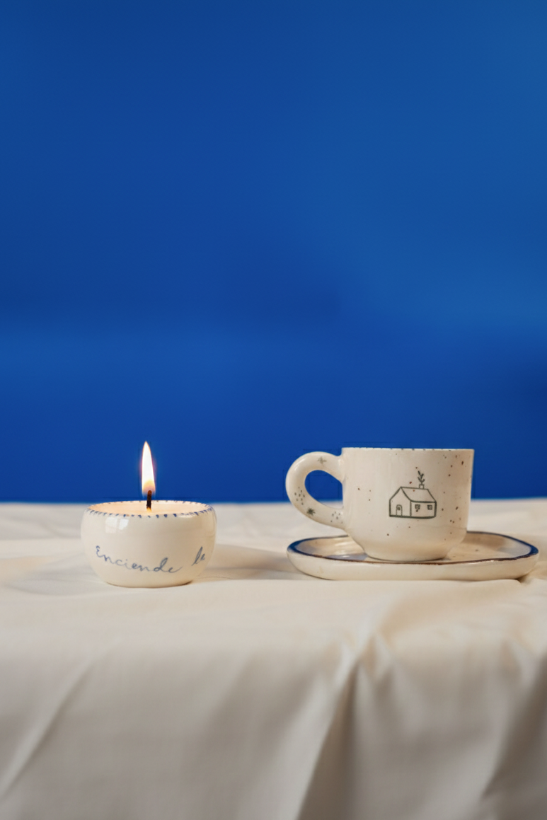 Vela de 130g con Pocillo 3 Oz & Plato 12 cm hecho en cerámica con ilustraciones de hogar. Un ritual para abrir la puerta a días más lentos, más íntimos, más nuestros.