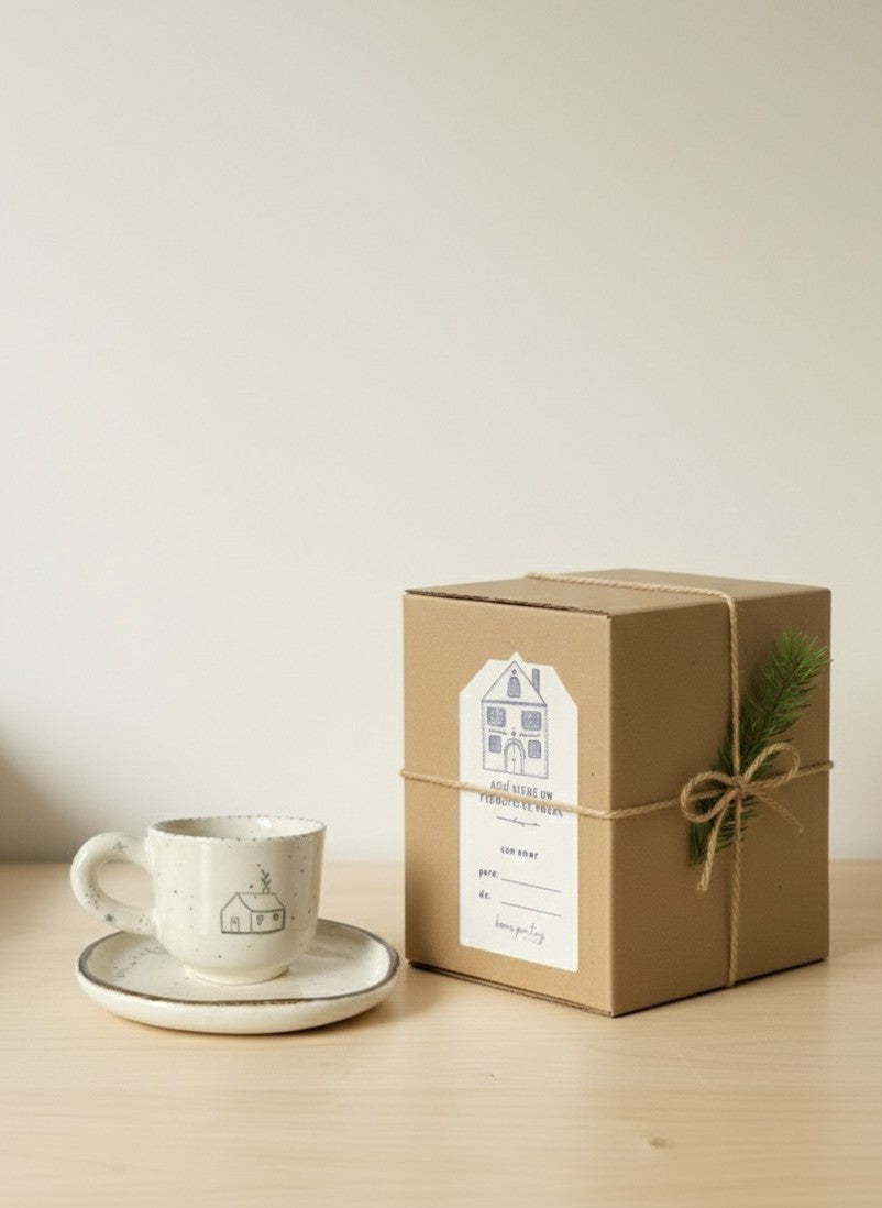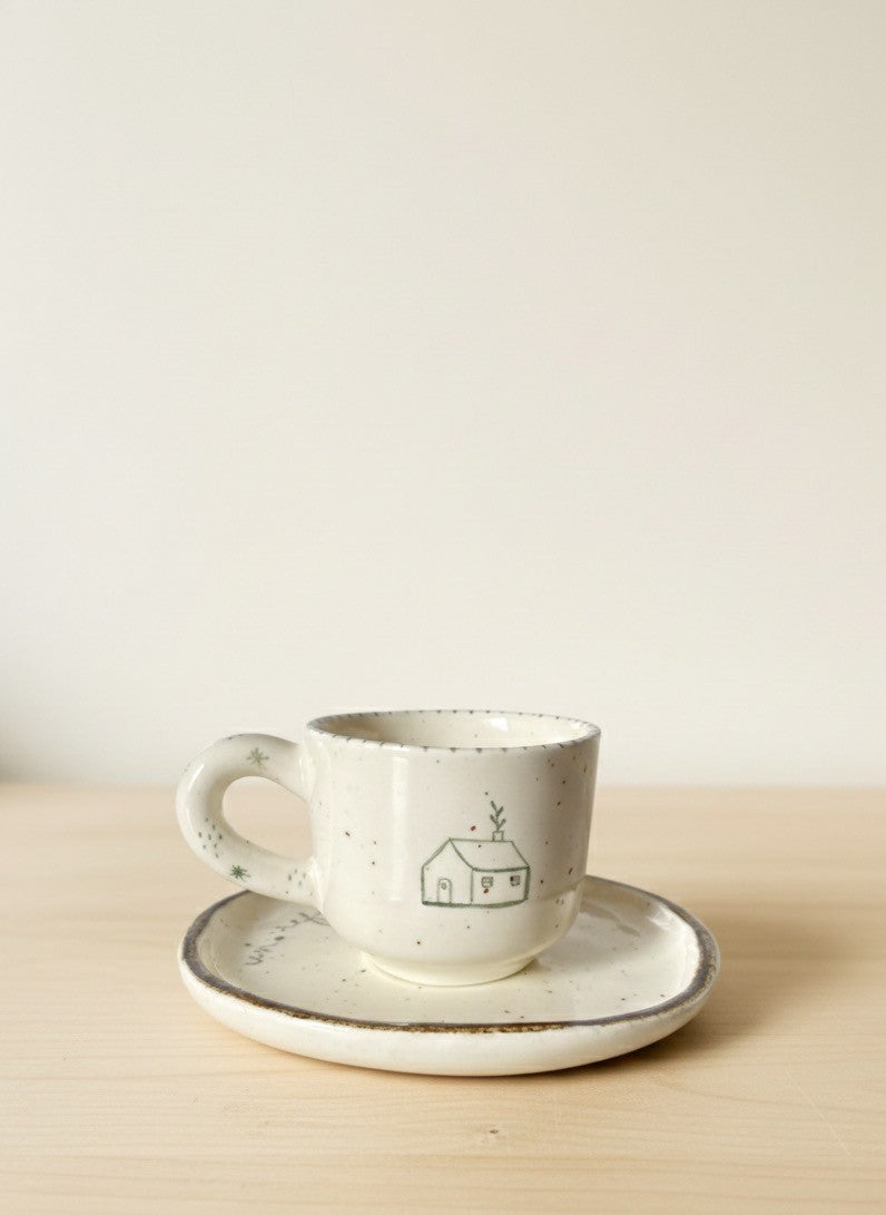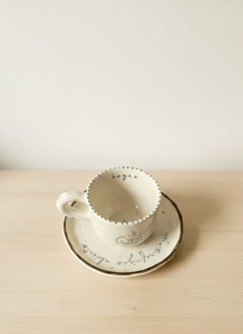Pocillo 3 Oz & Plato 12 cm Calor de Hogar ilustrado, que evoca el hogar, ese espacio que siempre habitamos.